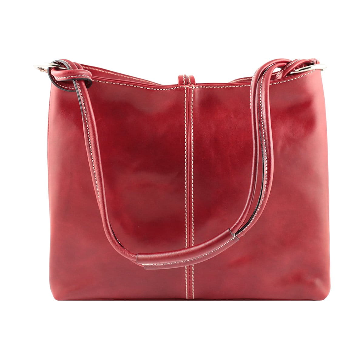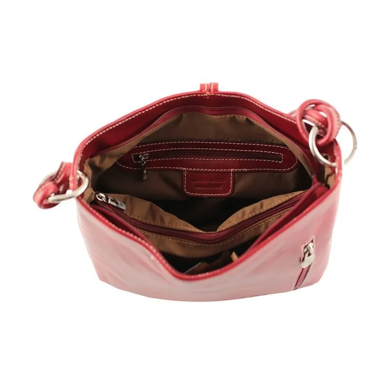 Torebka Firenze to prawdziwe dzieło włoskiej sztuki rzemieślniczej. Została wykonana z najwyższej jakości skóry licowej, garbowanej roślinnie i barwionej ręcznie, co nadaje jej naturalny i niepowtarzalny wygląd. Na zewnątrz znajduje się przednia kieszeń na suwak, natomiast wewnątrz trzy przestronne przegrody, w tym jedna zapinana, oraz dwie małe kieszonki na drobiazgi. Główne zapięcie to zamek błyskawiczny, który zapewnia bezpieczeństwo zawartości, a półsztywna konstrukcja oraz cztery metalowe stopki u podstawy gwarantują stabilność. Logo Fantini wytłoczone na gorąco oraz subtelny metalowy pierścień nadają całości elegancji i charakteru. Czerwony kolor modelu Firenze dodaje energii, stylu i wyjątkowości każdej stylizacji, czyniąc tę torebkę prawdziwym symbolem włoskiej klasy.