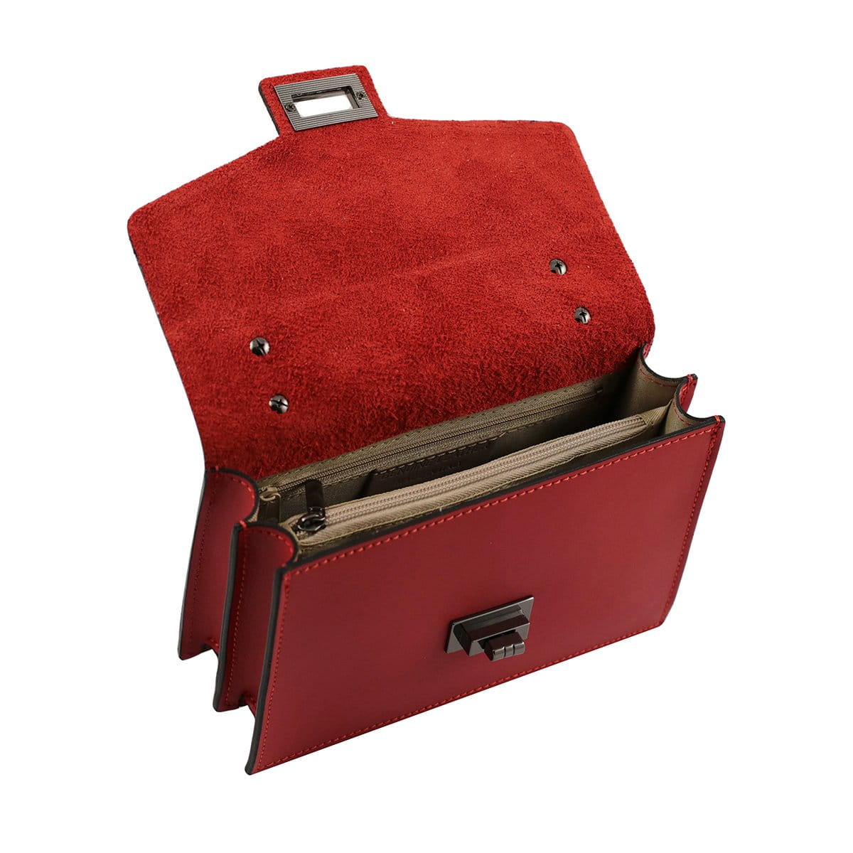 Ta torebka to doskonałe połączenie włoskiej jakości i elegancji. Wykonana ręcznie z najwyższej jakości skóry szczotkowanej i odwróconej, zachwyca wyjątkowym wyglądem, trwałością i dbałością o każdy detal. Sztywna konstrukcja zapewnia bezpieczeństwo przechowywanych rzeczy, a praktyczne zapięcie na zatrzask ułatwia codzienne użytkowanie. Regulowany metalowy pasek na ramię pozwala dopasować długość do indywidualnych preferencji, gwarantując wygodę noszenia w każdej sytuacji. Wnętrze torby zostało starannie wykończone bawełnianą podszewką ze stylowym nadrukiem Fantini i wyposażone w trzy przegrody, w tym jedną zapinaną na zamek, oraz małą kieszeń z suwakiem na drobiazgi. Intensywny czerwony kolor dodaje energii, charakteru i wyrazistości każdej stylizacji, czyniąc tę torebkę wyjątkowym dodatkiem, który przyciąga wzrok i podkreśla indywidualny styl.