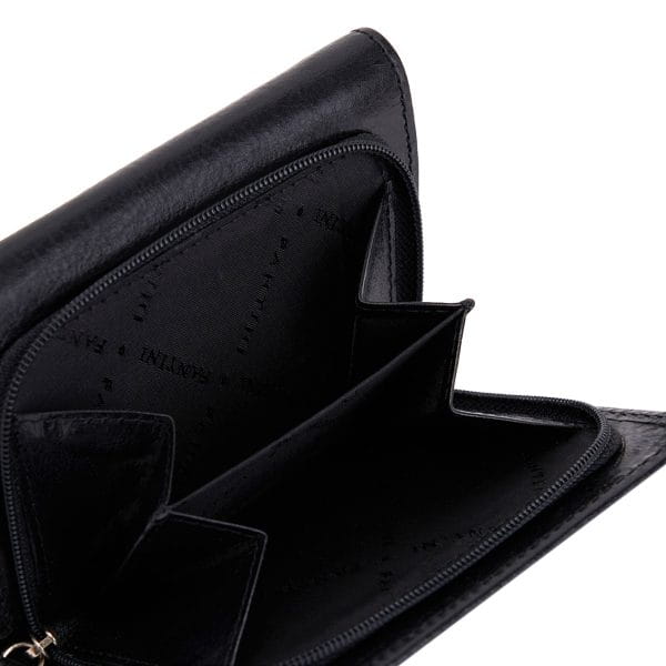 Portfel Eva ze skóry w kolorze czarnym to idealny dodatek dla nowoczesnej kobiety, która pragnie połączyć elegancję z praktycznością. Wykonany z luksusowej skóry licowej, zachwyca wyrafinowanym designem i doskonałą funkcjonalnością, dzięki czemu sprawdzi się w każdej sytuacji — od pracy po wieczorne wyjście. Model Eva oferuje 9 przegródek na karty, jedną przegrodę na banknoty oraz wewnętrzną kieszeń na monety zamykaną na zamek błyskawiczny, co pozwala na utrzymanie porządku i bezpieczeństwa wszystkich niezbędnych rzeczy. Czarna skóra nadaje mu ponadczasowego charakteru i klasy, czyniąc z niego elegancki dodatek pasujący zarówno do stylizacji formalnych, jak i codziennych. Portfel jest kompaktowy, lekki i łatwy do przenoszenia, a jednocześnie wystarczająco pojemny, by pomieścić wszystko, co najważniejsze. Dzięki solidnemu wykonaniu i dbałości o każdy detal, Eva zachowuje swój nienaganny wygląd przez lata użytkowania. To obowiązkowy element w kolekcji każdej kobiety, która ceni włoski styl, jakość i trwałość.
