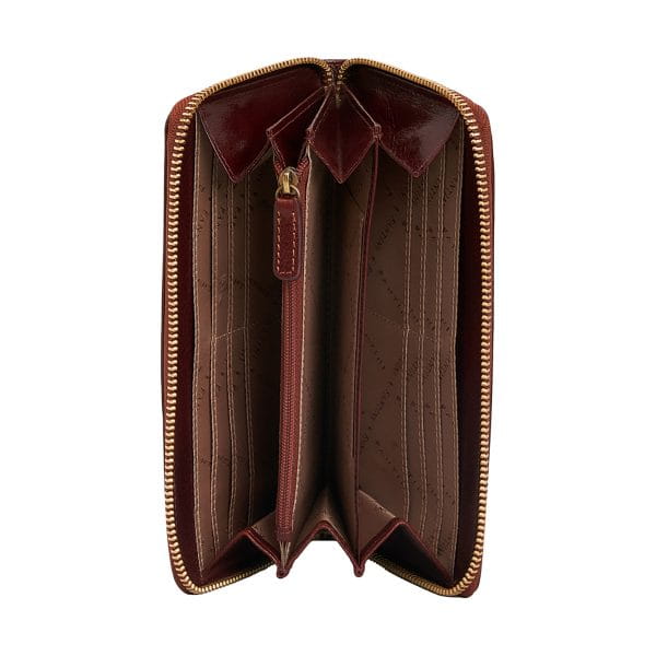 Portfel Maia ze skóry w kolorze brązowym to hołd dla klasycznej elegancji i włoskiego rzemiosła. Wykonany z najwyższej jakości prawdziwej skóry toskańskiej, zachwyca ciepłym, głębokim odcieniem brązu, który nadaje mu ponadczasowego charakteru. Idealny dla kobiet ceniących połączenie wyrafinowania i praktyczności. Wnętrze portfela zostało starannie zaprojektowane – znajdziesz w nim liczne przegrody na karty, banknoty i dokumenty, a także kieszeń na monety zamykaną na suwak, gwarantującą bezpieczeństwo drobnych przedmiotów. Całość zamykana jest na solidny zamek błyskawiczny, który chroni zawartość i dodaje elegancji. Każdy detal portfela Maia odzwierciedla mistrzostwo toskańskich rzemieślników – od wyboru skóry po ręczne wykończenia. To nie tylko praktyczny dodatek, ale także symbol włoskiej jakości i stylu, który przetrwa próbę czasu.